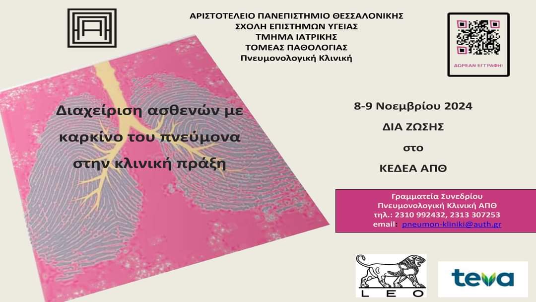 Στις 8 και 9 Νοεμβρίου 2024 πραγματοποιείται στο ΚΕΔΕΑ ΑΠΘ το συνέδριο με τίτλο «Διαχείριση ασθενών με καρκίνο του πνεύμονα στην κλινική πράξη» που διοργανώνεται από την Πνευμονολογική Κλινική ΑΠΘ του Γενικού Νοσοκομείου «Γεώργιος Παπανικολάου»