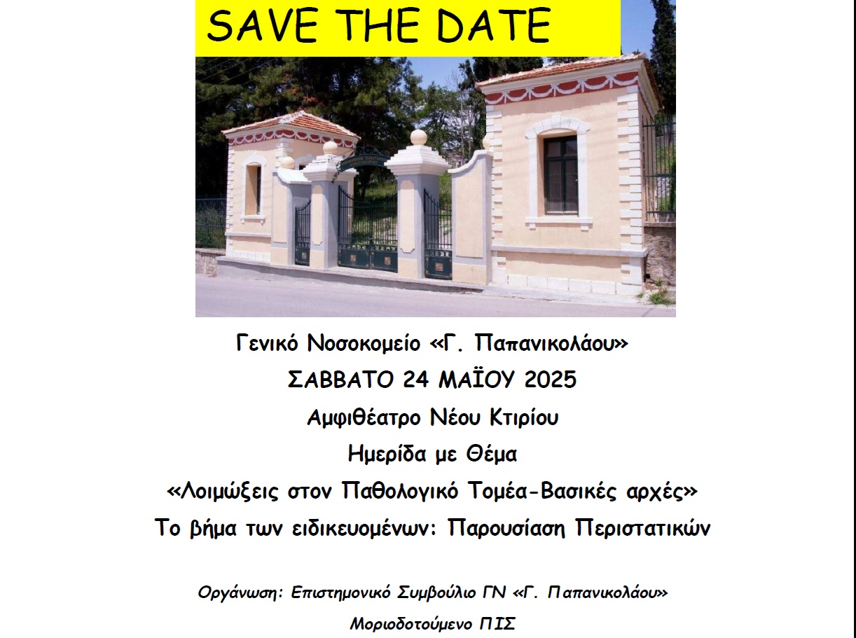 Ημερίδα με θέμα “Λοιμώξεις στον Παθολογικό Τομέα – Βασικές αρχές – Το βήμα των ειδικευομένων-Παρουσίαση Περιστατικών” πραγματοποιείται το Σάββατο 24 Μαΐου 2025 στο Αμφιθέατρο του Νέου Κτιρίου στο Γενικό Νοσοκομείο “Γεώργιος Παπανικολάου”. Διοργάνωση: Επιστημονικό Συμβούλιο