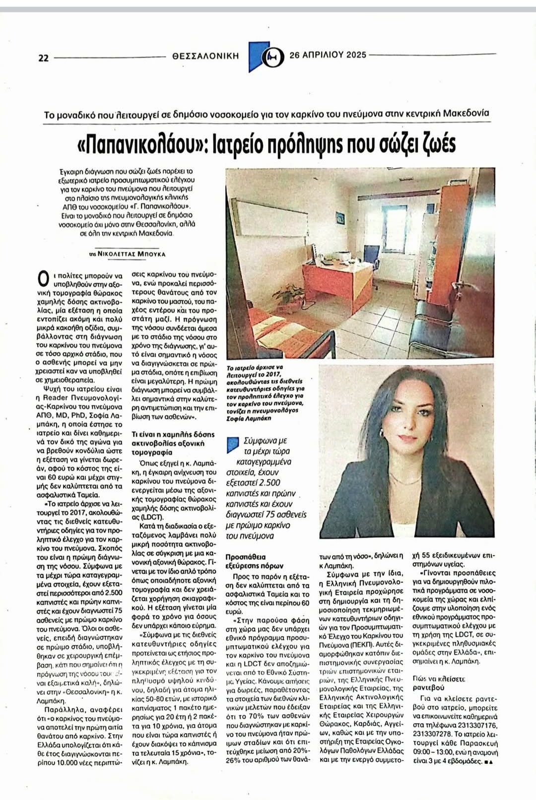 “Εγκαιρη διάγνωση που σώζει ζωές παρέχει το Εξωτερικό Ιατρείο Προσυμπτωματικού ελέγχου για τον καρκίνο του πνεύμονα που λειτουργεί στο πλαίσιο της Πνευμονολογικής Κλινικής ΑΠΘ του Νοσοκομείου “Γ.Παπανικολάου”. Είναι το μοναδικό που λειτουργεί σε δημόσιο νοσοκομείο όχι μόνο στη Θεσσαλονίκη, αλλά σε όλη την Κεντρική Μακεδονία”. (εφημερίδα Θεσσαλονίκη, 26.4.2025)