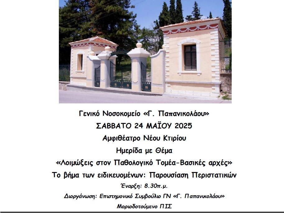 Το Σάββατο 24 Μαΐου 2025, στο Αμφιθέατρο του Νέου Κτιρίου του Γενικού Νοσοκομείου «Γεώργιος Παπανικολάου», θα πραγματοποιηθεί επιστημονική ημερίδα με θέμα: