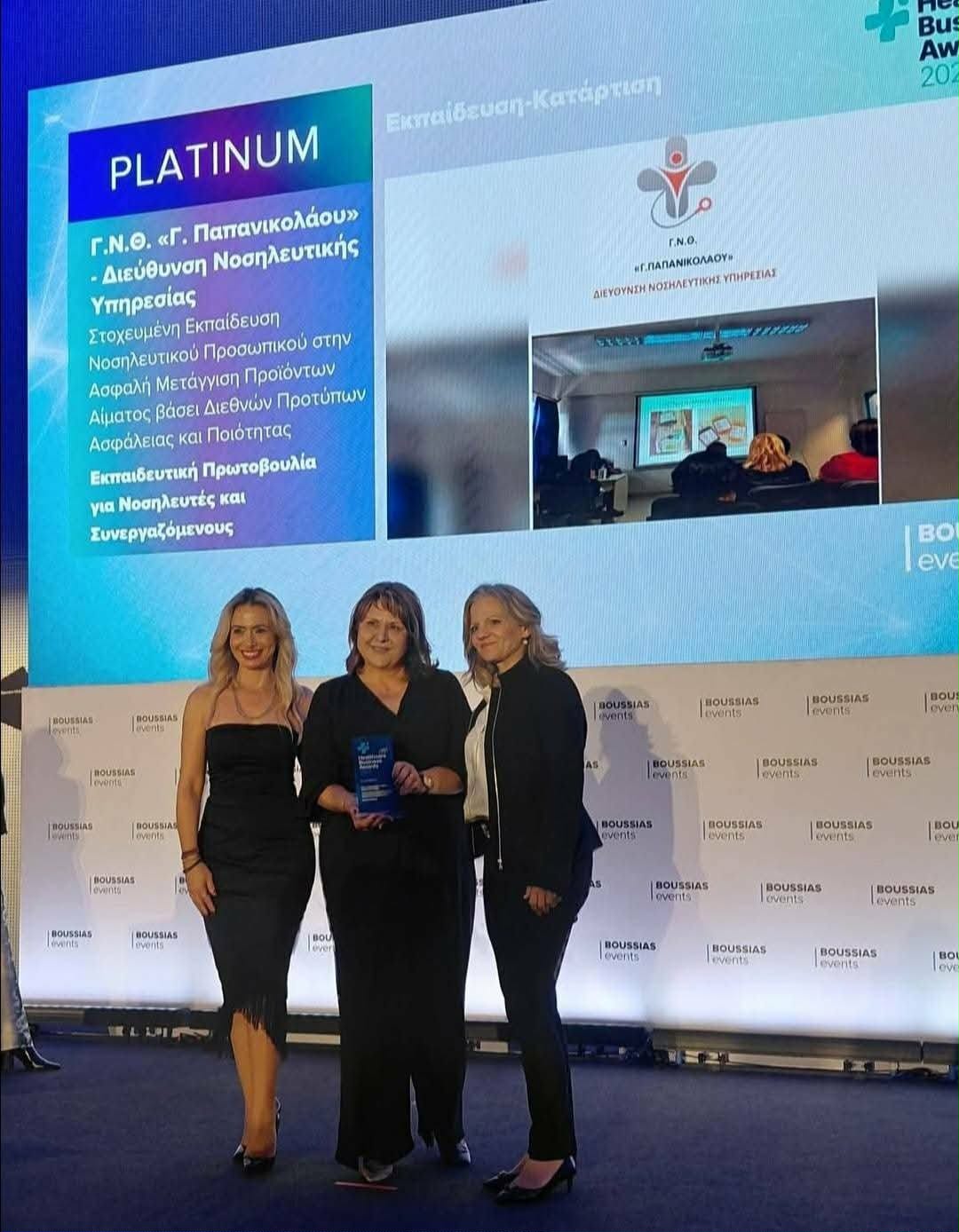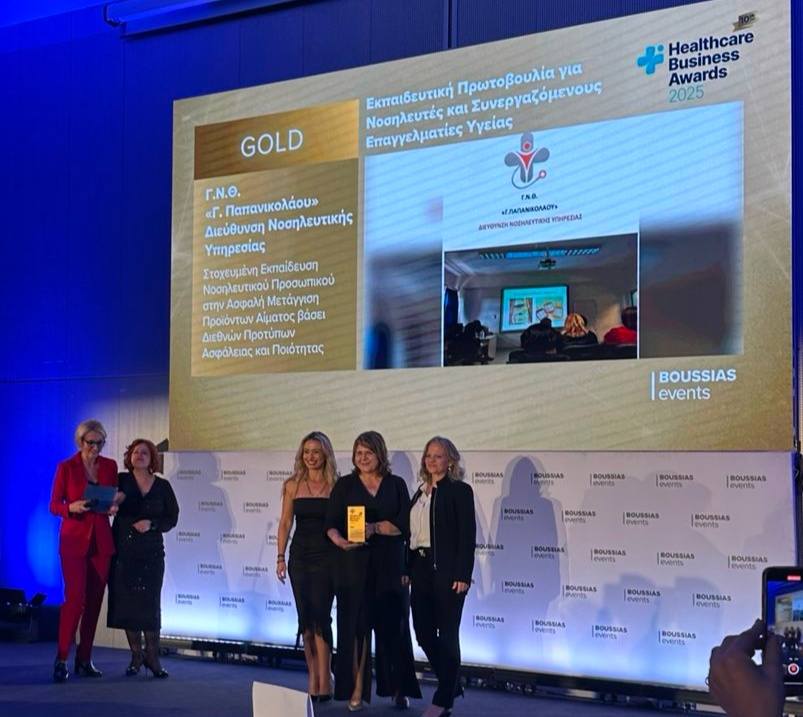 Mε δύο βραβεία Gold και Platinum βραβεύτηκε η Διεύθυνση της Νοσηλευτικής Υπηρεσίας του Γενικού Νοσοκομείου Θεσσαλονίκης “Γεώργιος Παπανικολάου” στην 10η τελετή απονομής των βραβείων Healthcare Business Awards 2025 που πραγματοποιήθηκε στις 18 Νοεμβρίου στην Αθήνα στο Συνεδριακό Κέντρο της Εθνικής Ασφαλιστικής.
