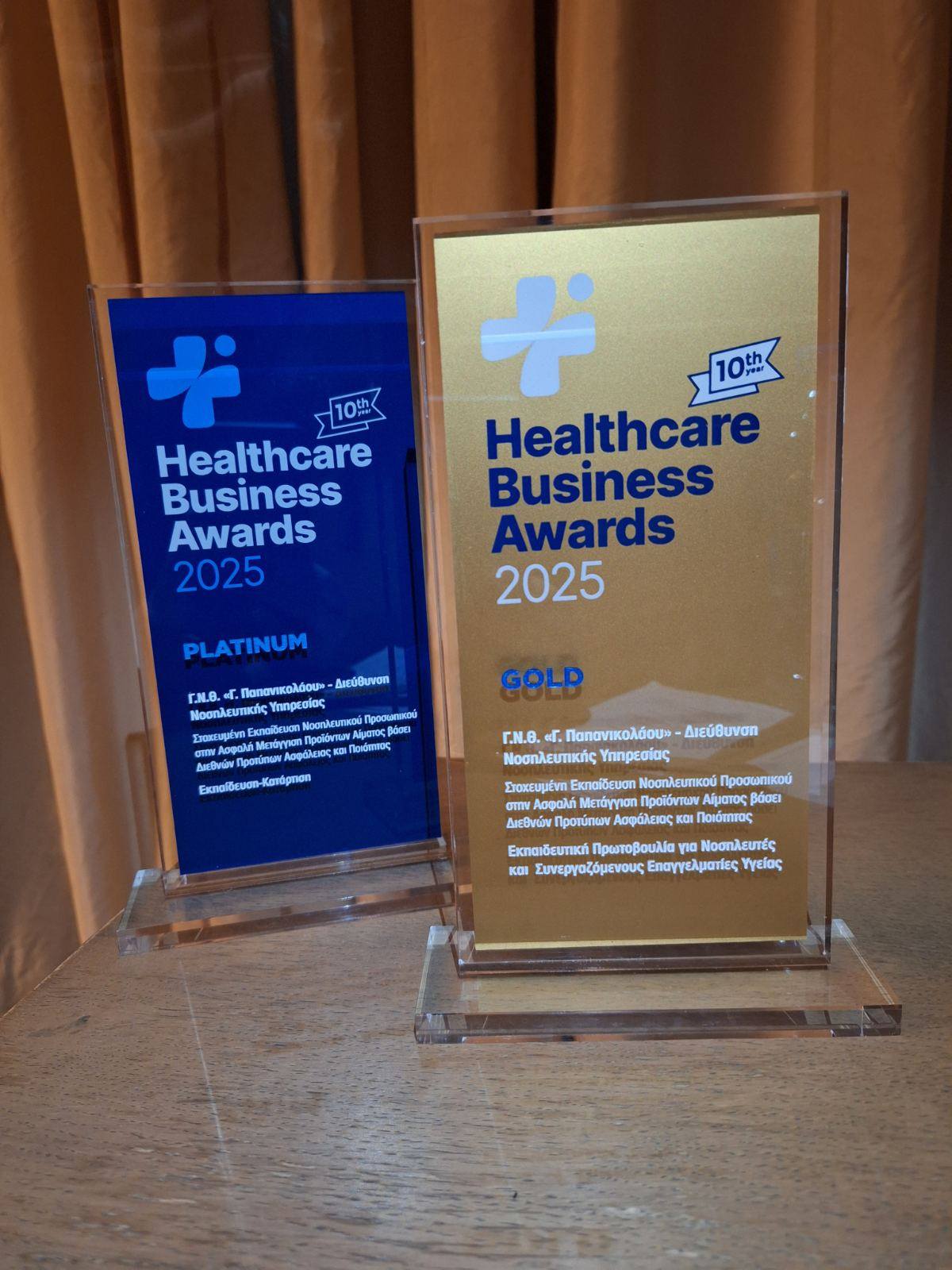 Οι διακρίσεις αφορούν την κατηγορία Εκπαίδευση – Κατάρτιση και την κατηγορία Εκπαιδευτική Πρωτοβουλία για Νοσηλευτές και Συνεργαζόμενους Επαγγελματίες Υγείας, όπου η Διεύθυνση Νοσηλευτικής Υπηρεσίας του Νοσοκομείου έλαβε Gold και Platinum διάκριση για την στοχευμένη εκπαίδευση νοσηλευτικού προσωπικού στην Ασφαλή Μετάγγιση Προϊόντων Αίματος βάσει Διεθνών Προτύπων Ασφάλειας και Ποιότητας.